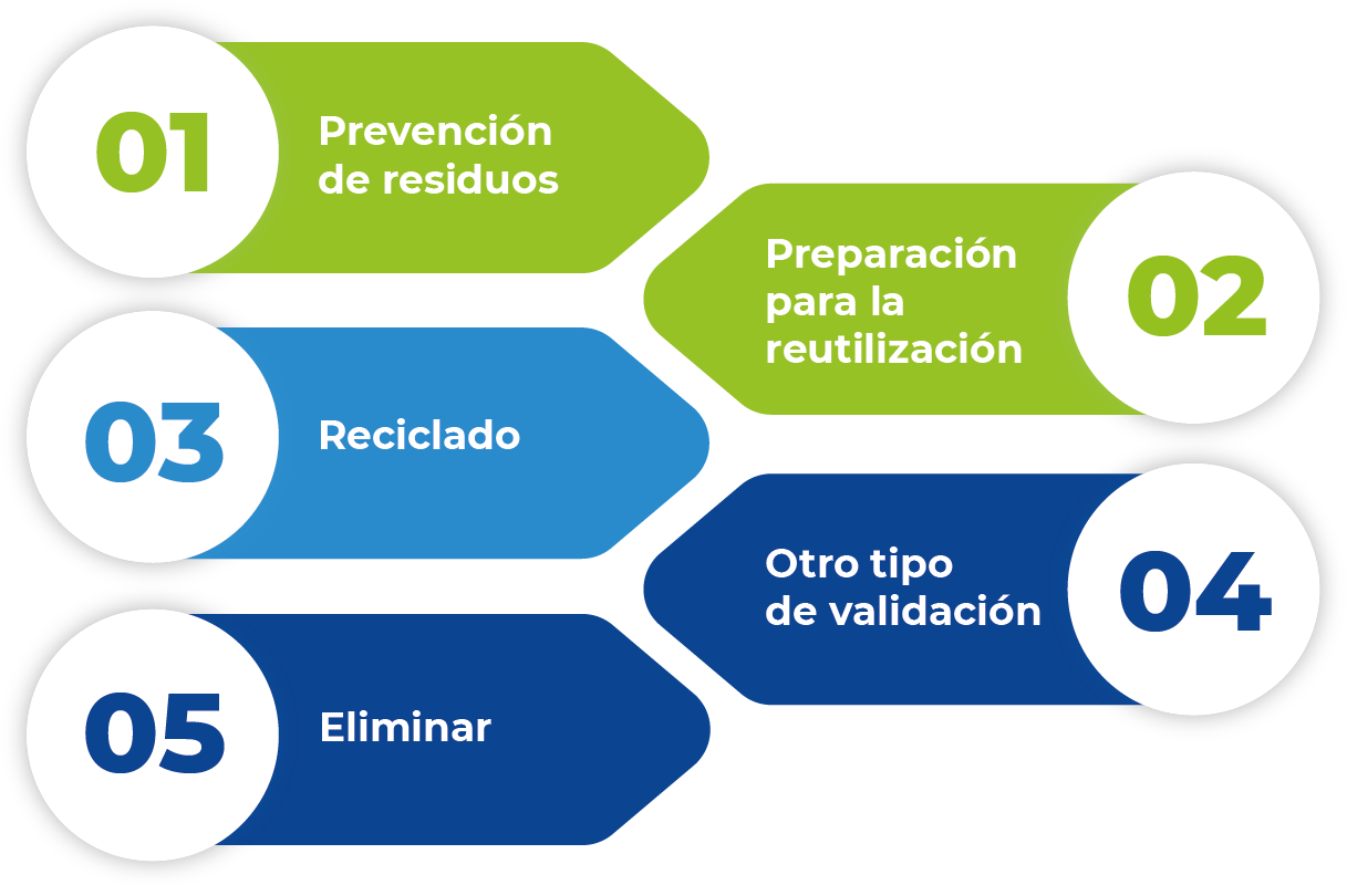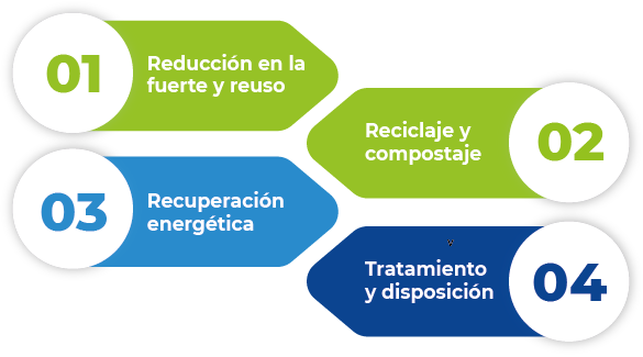 En el enfoque Unión Europea, la primera etapa es prevenir la generación del residuo. Luego vienen las acciones para la reutilización. Una tercera etapa es el reciclado. La cuarta etapa son las acciones de valorización alternativas, como compostaje o aprovechamiento energético. La etapa final es la eliminación.