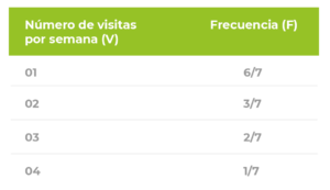 V = Número de visitas por semana del vehículo de recolección y está relacionado con la frecuencia de recolección dada en la tabla siguiente: